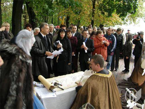Что там было? Вот короткий фоторепортаж из этого мероприятия нашего внештатного автора. Кстати, мэр Чернигова Александр Соколов оставил свою запись в родовой книге черниговских князей. В это время один из первых князей нашего города - Мстислав - спокойно наблюдал за попыткой городского головы очередной раз попасть в историю :).