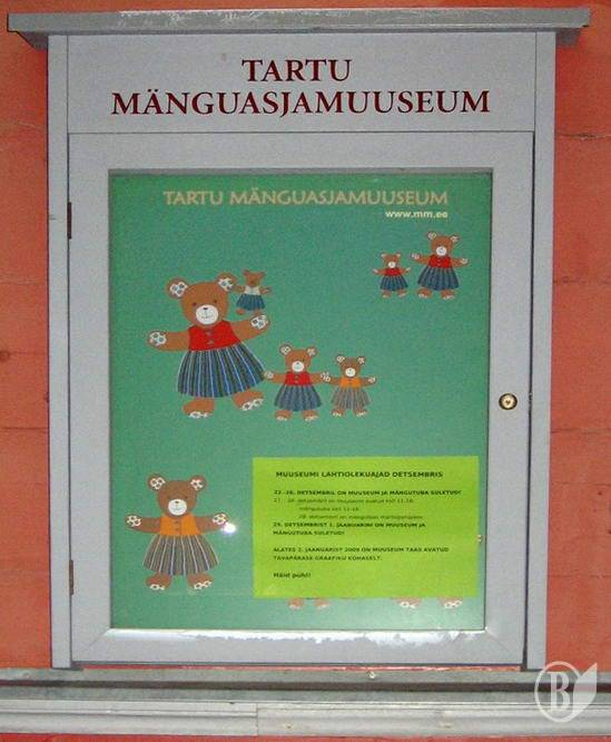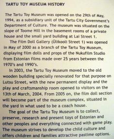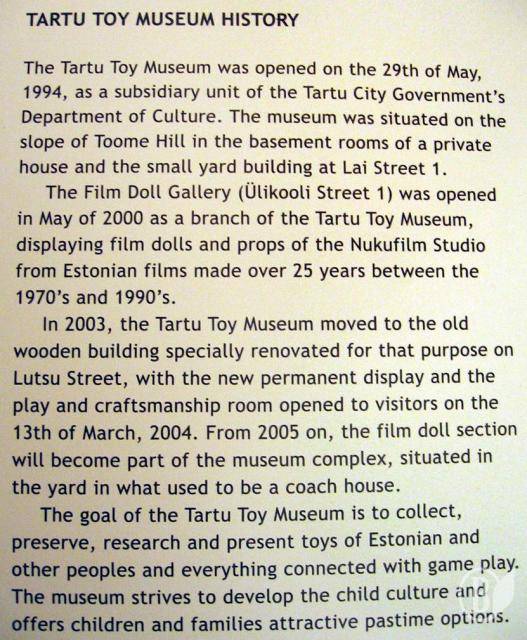 А от у Тарту музей іграшок займає окремий будинок. Тут представлені ляльки різних часів та народів, дитячі забавки, зроблені з дерева, дроту, паперу, тканини та інших матеріалів.