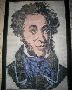 Л. В. «В детстве вышивала много маков, оленей, Ленина. Ранее канвы не было, как теперь, вытягивали ниточки из ткани, чтобы сделать сетку под вышивку, сами рисовали картинку. У меня из самых первых работ сохранилась вышивка А. С. Пушкина, она мне очень нравится. По-видимому, ностальгия за детством».