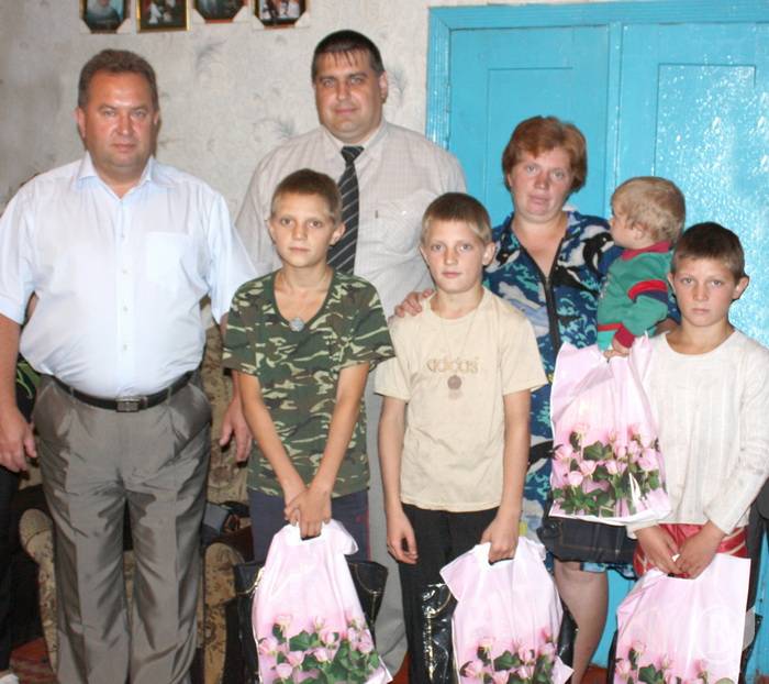 Галина Александровна и Николай Иванович Титкачи из села Спасское Сосницкого района воспитывают четырёх детей и о своих материальных проблемах рассказали в одной из областных газет. Они жаловались, что не могут собрать детей к школе. Именно спортивные костюмы, которые еще родители не купили, и канцтовары получили в подарок школьники Сергей, Виктор и Валентин. Примеряя обновки, дети радовались и говорили, что по физкультуре у них обязательно будут наивысшие баллы. Конечно, не остался без внимания и наименьший Валерий. Все дети также получили к празднику конфеты.