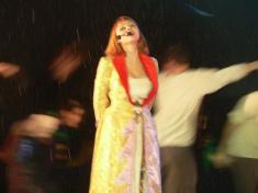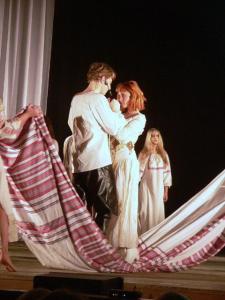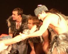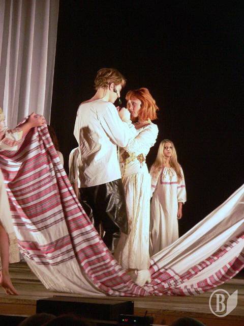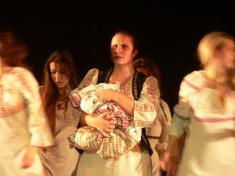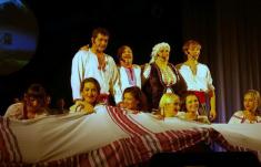 – И за это он сгорает в огне, которым забавляется нечистый. Очень красиво поставлена эта сцена – волны красных тканей, адские герои в красной одежде. Выглядит просто-таки, что Бульба горит по-настоящему. Еще очень интересен сюжет, где гости растягивают огромный рушнык, создавая иллюзию самого настоящего застолья. Поражают и жилистые казачьи торсы в волчьих шкурах, особенно их, как я себе назвала, «Коломыя на плечах». Вы проработали много источников для того, чтобы поставить этот мюзикл.