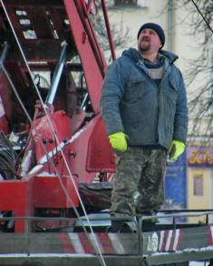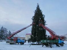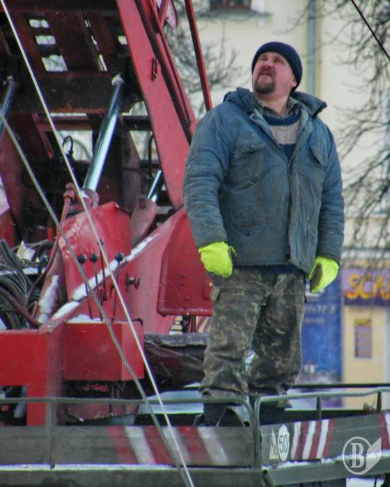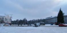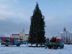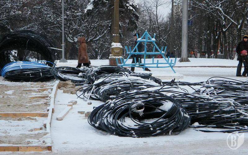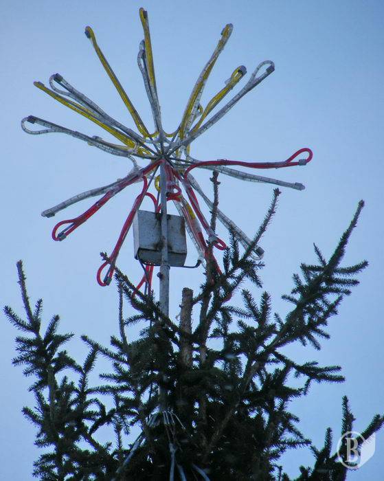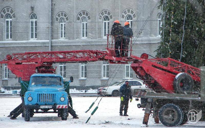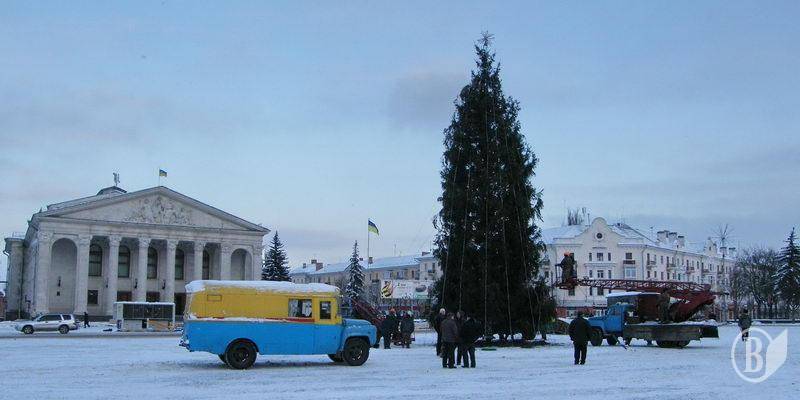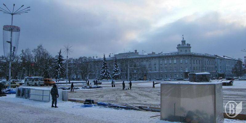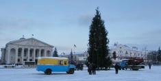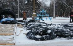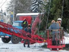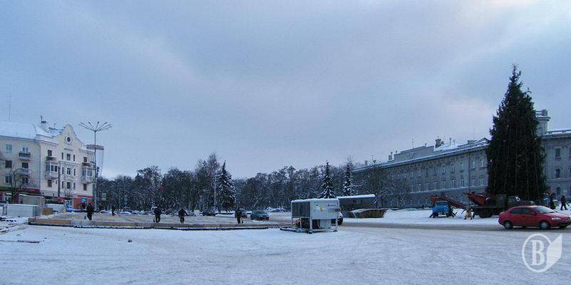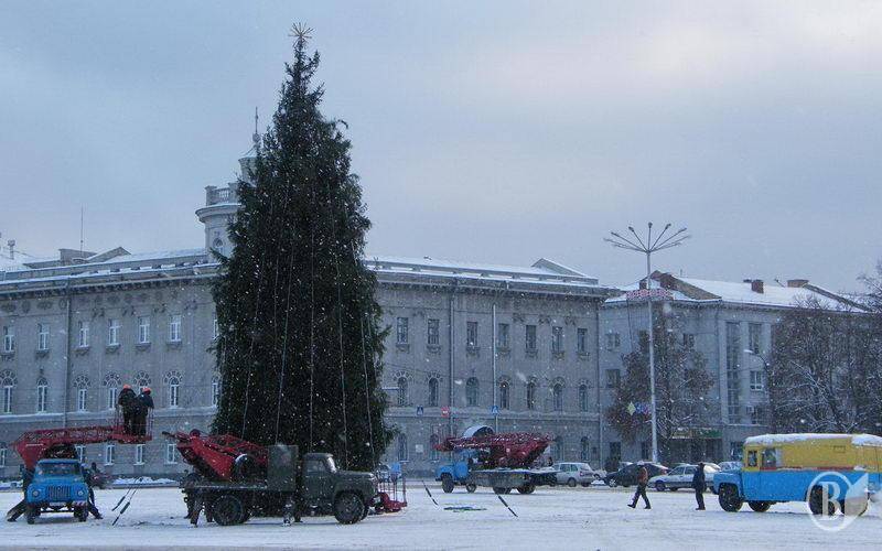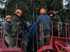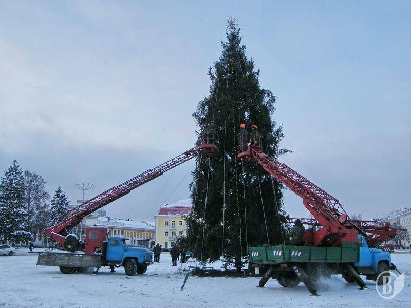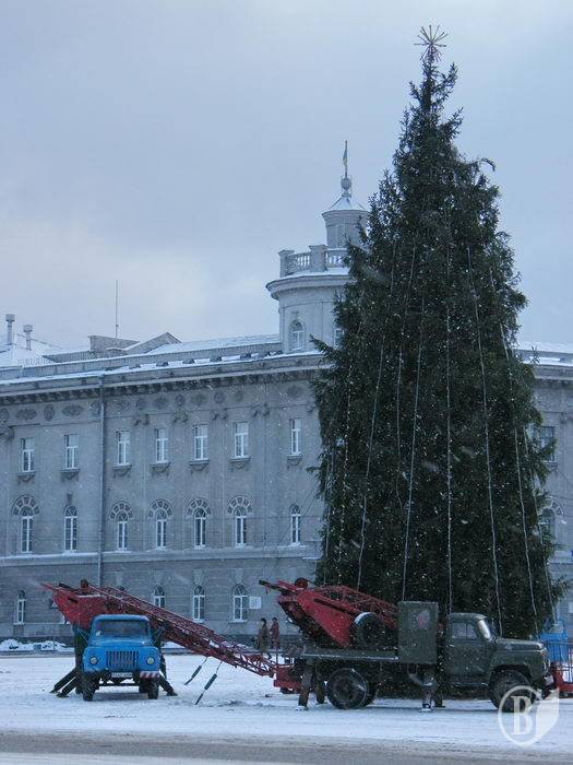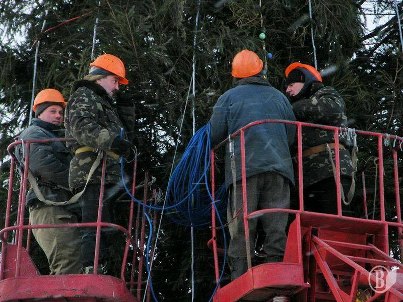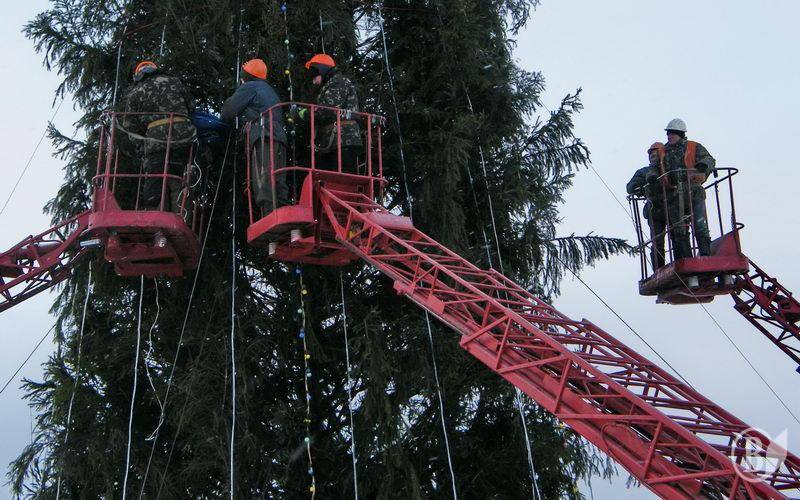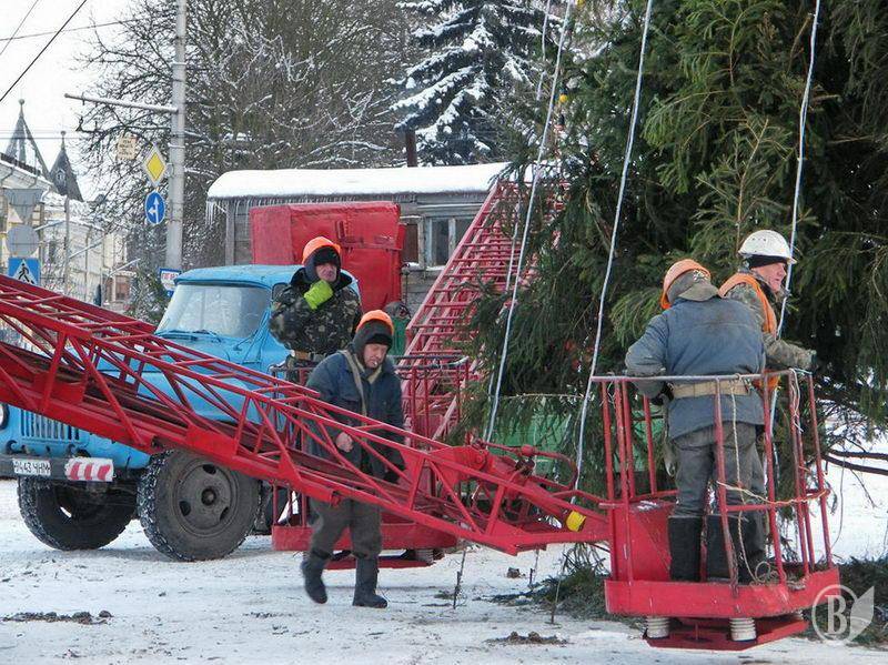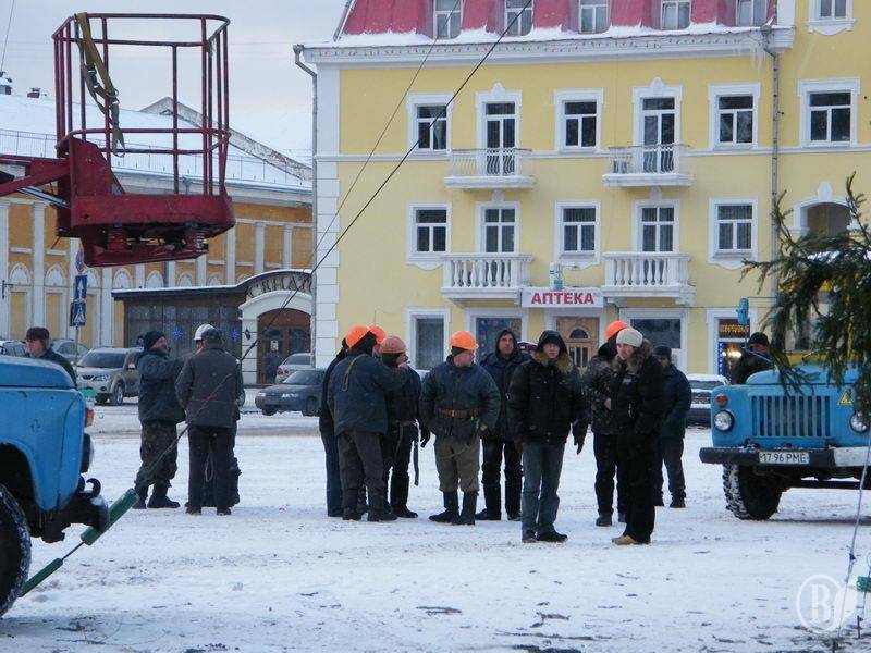 На Красній площі у Чернігові встановлено новорічну ялину. На даний час численні похмурі чоловіки без зайвого поспіху «зв’язують» її дротами.