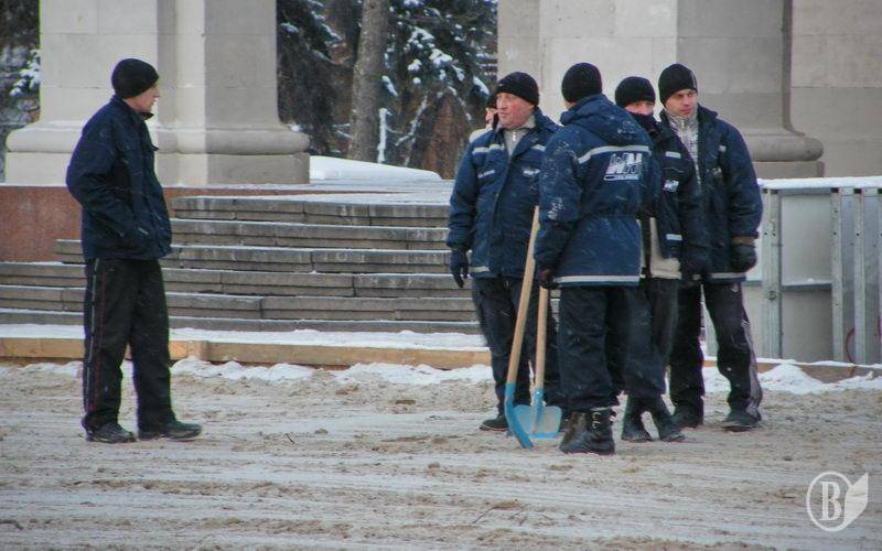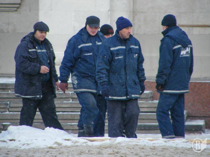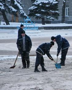 Пустелею пересуваються молоді люди у синіх жупанах і з лопатами. Схоже, вони імітують роботу над покриттям майбутньої ковзанки.