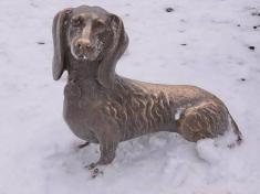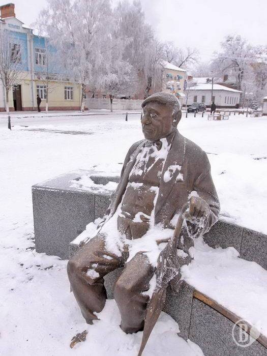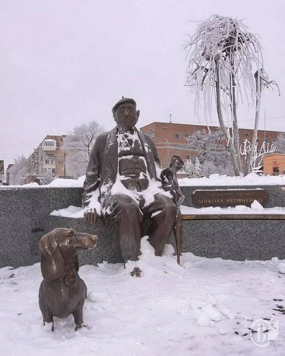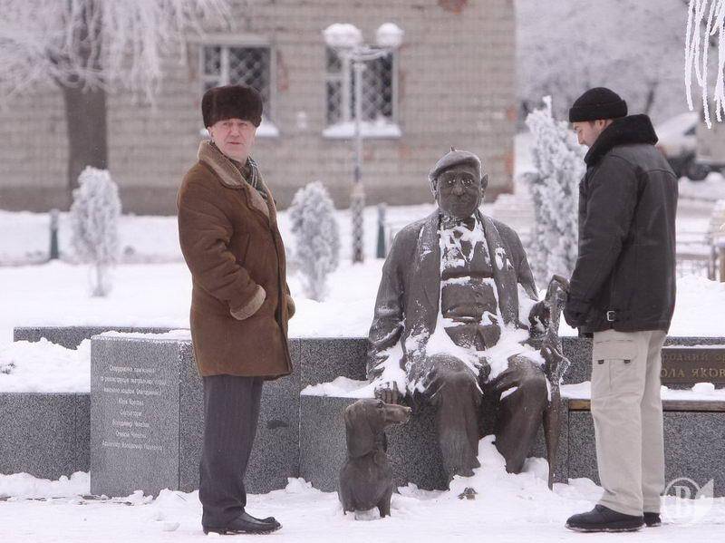 У місті Прилуки, на реконструйованій коштом мецената центральній площі за будь-якої погоди зустрічає перехожих Народний артист Микола Яковенко зі своїм чотириногим другом.