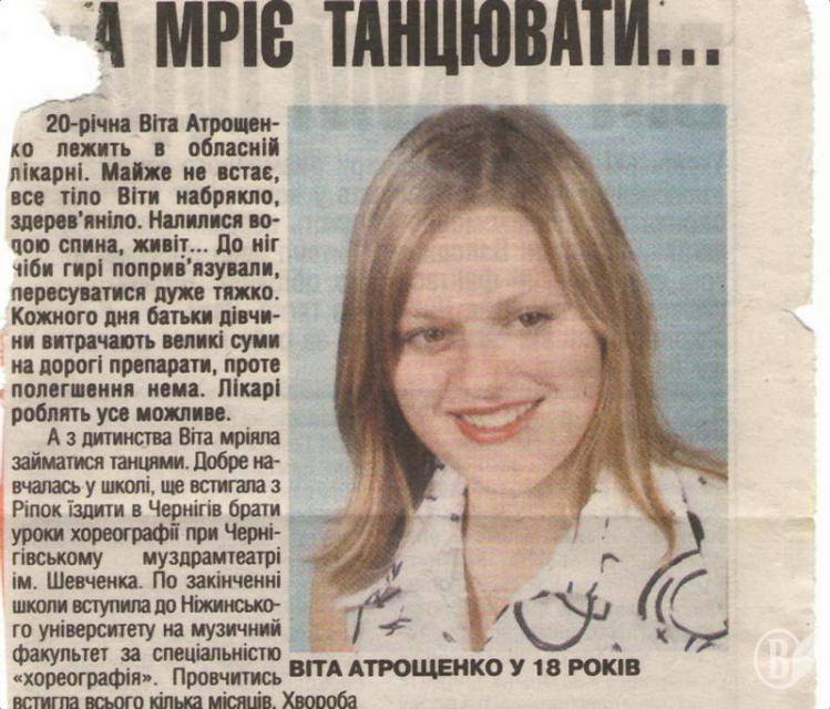 20-річна Віта Атрощенко лежить в обласній лікарні. Майже не встає, все тіло Віти набрякло, здерев’яніло. Налилися водою спина, живіт… до ніг ніби гирі поприв’язували, пересуватися дуже важко.