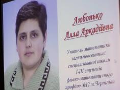 - Любонько Алла Аркадіївна – учитель математики спеціалізованої школи фізико-математичного профілю № 12 м. Чернігова, старший учитель, переможець у номінації “математика”;