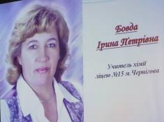 - Бовда Ірина Петрівна – учитель хімії ліцею № 15 м. Чернігова, учитель-методист, “Відмінник освіти України” – переможець у номінації “хімія”;