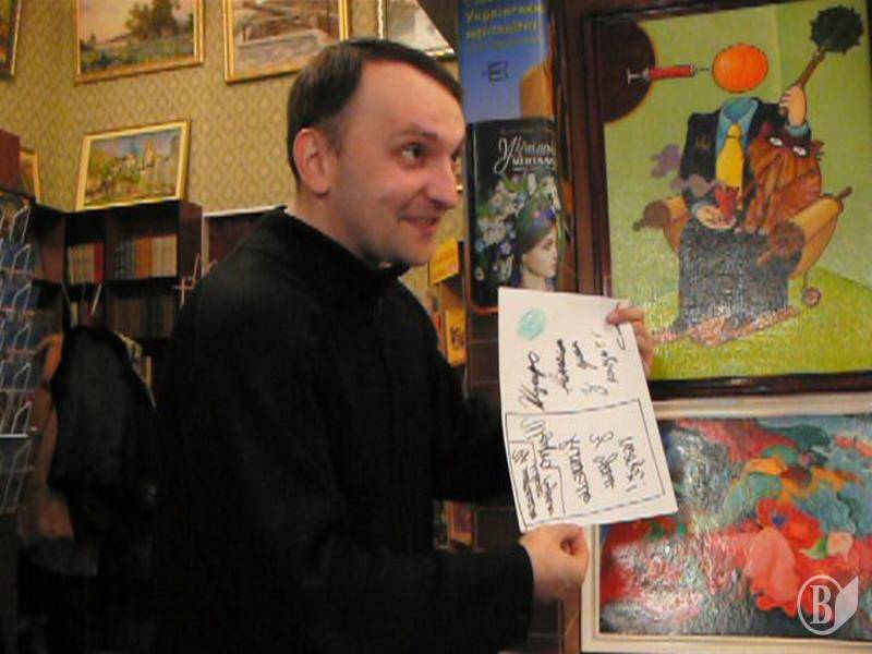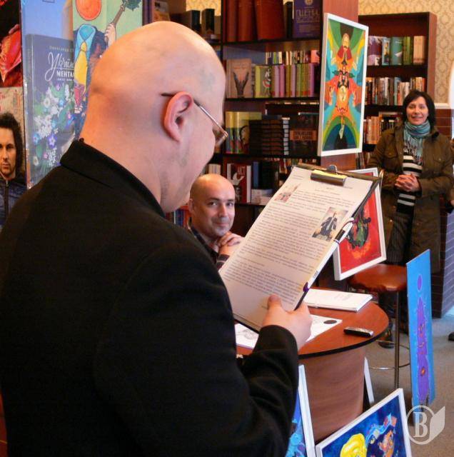 Під час відкриття виставки, митець здійснив мистецький «перформенс». Обома руками, лівою та правою, зробив подарунковий напис на аркуші паперу.