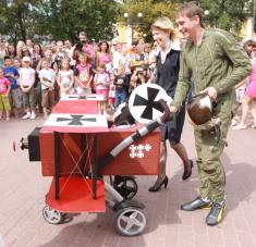 Один из малышей «прилетел» на этот праздник на вертолёте, другой – на самолетике, еще один – на беби-такси, несколько – на танках, в которые превратились их коляски благодаря родителям.