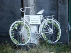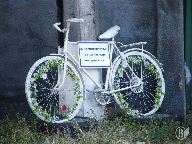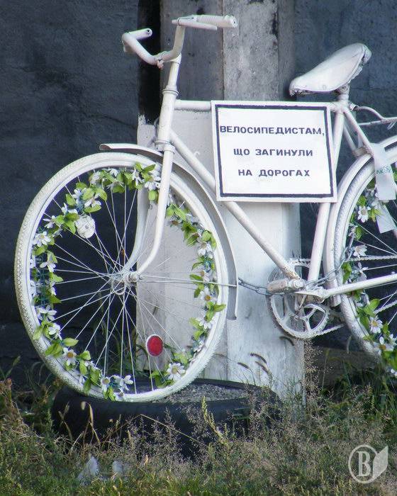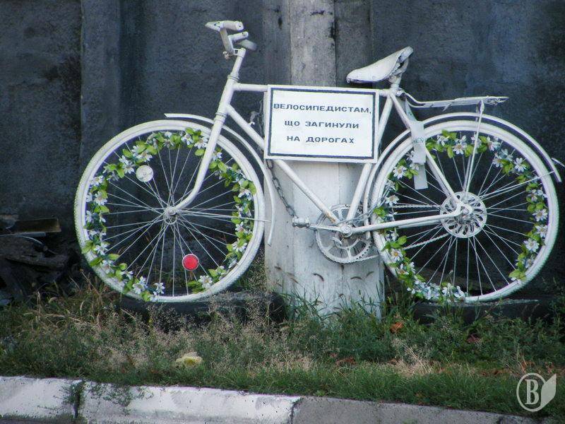 В Киеве на улице Мельникова стоит своеобразный памятник погибшим на дорогах велосипедистам – прикованный на вечную стоянку шоссейный велосипед, полностью окрашенный в белое.