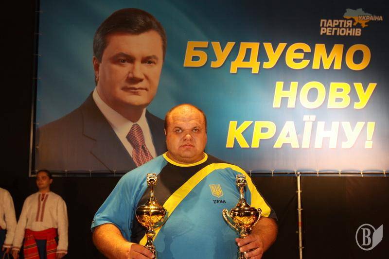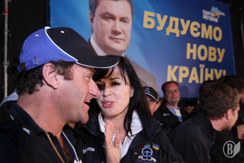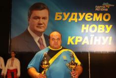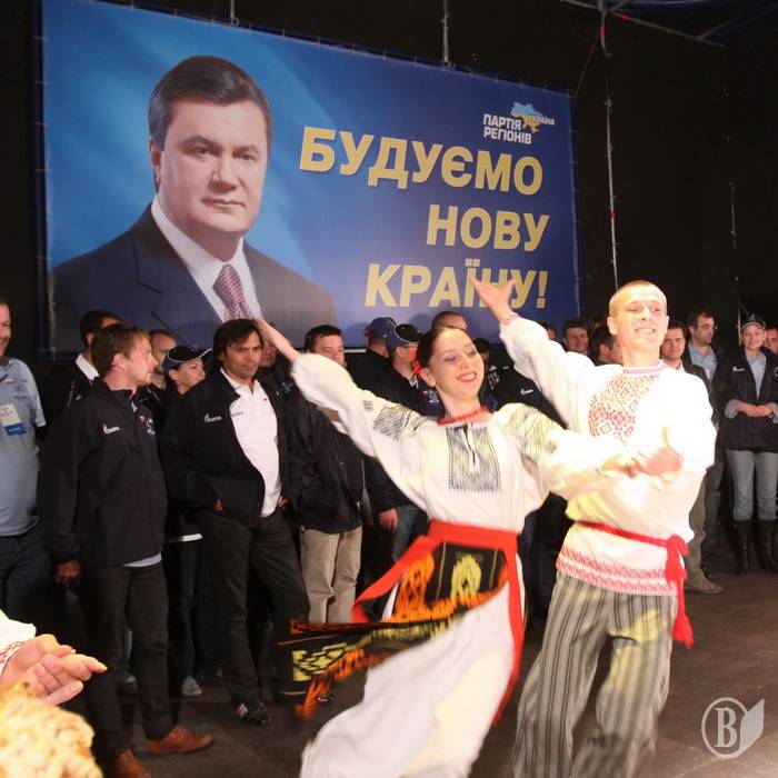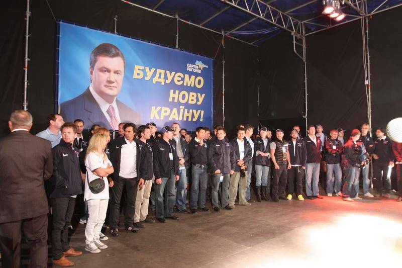 На сцене около облмуздрамтеатра красовался большой портрет Януковича с его юлюбленим лозунгом последнего времени "Строим новую страну".