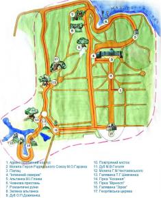 Тут збереглись паркові мости, овіяні легендами гірки Кохання і Вірності, «Романтичні» руїни на березі Великого ставу, які є унікальною пам'яткою садово-паркового мистецтва XVIII ст. В парковому масиві нараховується понад 50 порід дерев і 30 видів кущових.