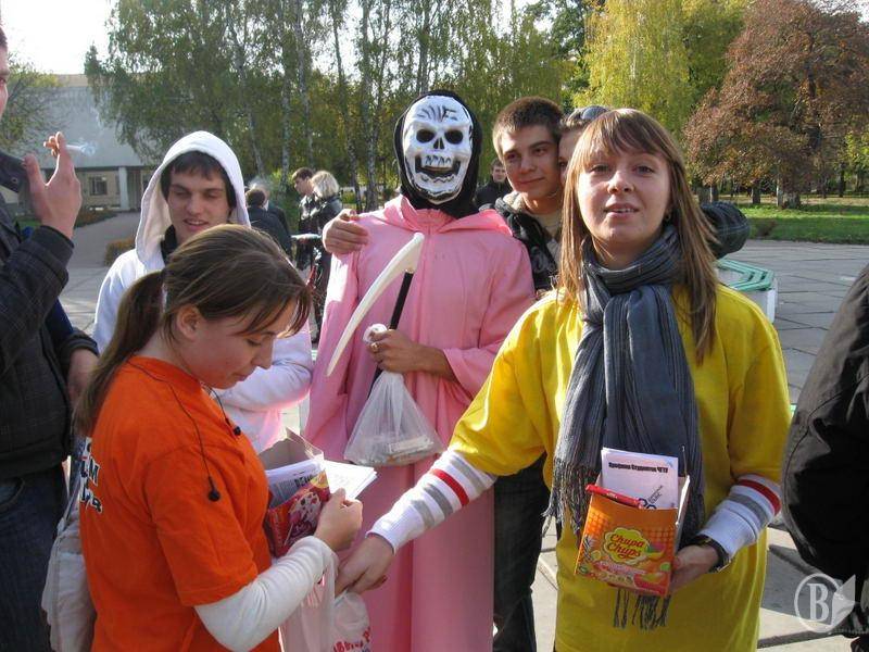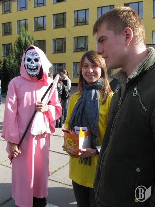 Во время акции волонтеры обменивали у студентов сигареты на конфеты. Для тех, кто не хотел обменивать папиросу и продолжал курить, неутомимо работал другой персонаж – «смерть с косой». Она подходила к самым упрямым студентам и уже собственным страшноватым видом показывала молодежи, к каким последствиям может привести их гиблая привычка, «вынуждая» студентов все же выбирать конфеты.