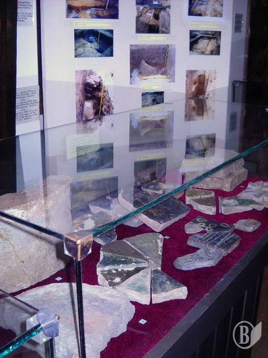 - Це будівельні матеріали, причому досить різноманітні. Тут є плінфа особливої форми, а на фото – фрагмент архітектурного поясу, в якому вона використовувалася. Цікаво, що плінфа була знайдена в житловій споруді ХІІ ст., піч якої була повністю складена з плінфи. Представлені також різноманітні плитки для підлоги – різного розміру, а також з розписом. Варто висловити подяку нашому реставратору, тільки завдяки йому вони набули яскравого вигляду, а були дуже тьмяні. Є також цікаві фрагменти фрескового розпису, тиньку з розписом, на якому є графіті. Найкращі фрески з нашої колекції можна побачити в експозиції Борисоглібського собору.