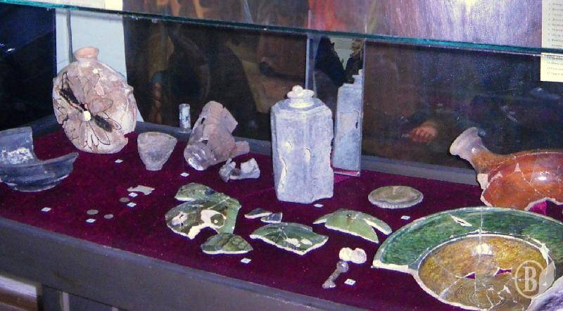 - Це культові речі – хрест, фрагмент окладу невеликої ікони з перламутру (маємо припущення, що його зробили ті ж різники, які вирізали гравюри для видань Чернігівської типографії). До речі, нам нарешті вдалося знайти, де знаходилася ця типографія, а також вивчити всю структуру подібних споруд. Ми дослідили і житла монахів, і житла обслуги монастиря, адже він був великим і за територією, і значенням. Особливо цікавий експонат – олов’яний штоф, ймовірно, його використовували для міцних напоїв. Зазвичай штофи робили як керамічні, так і металічні, в к. XVII-п.XVIII ст. в моду увійшло олово, адже з нього було легко виплавляти різноманітні предмети. Цей експонат добре зберігся, навіть пробка. Також він прикрашений різьбленими зображеннями – це і рослинний орнамент, і людські фігури: козак з келихом, жінка з глечиком, вдягнені в цікаві костюми.