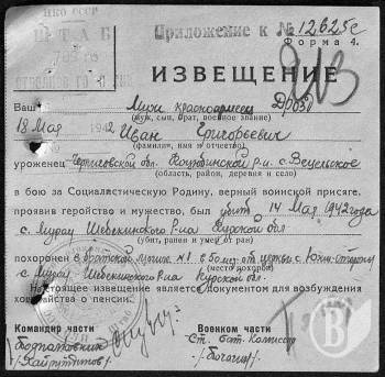 Працівники військових комісаріатів в 50-х – 80-х роках ХХ ст. в ході кропіткої роботи по вивченню тоді засекречених архівних документів знаходили свідчення однополчан і відновлювали справжні обставини загибелі земляків, як вважались безвісти зниклими. Нині, вивчаючи документи ЦАМО, маємо унікальну можливість уточнити раніше отримані родичами повідомлення про долю червоноармійця і навіть місце його поховання.