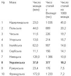 За числом статей у Вікіпедії, створених на 1000 носіїв мови, українці на восьмому місці у світовому рейтингу народів, які мають більше 10 мільйонів мовців, повідомляє Юрій ПЕРОГАНИЧ, виконавчий директор громадської організації "Вікімедіа Україна".