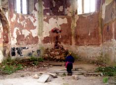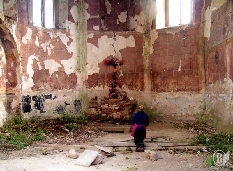 Фото зроблене у м. Язловець Тернопільської області і має свою історію: самотня жінка щодня приходить до зруйнованого та оскверненого римо – католицького костелу XVI ст для того, аби винести з нього сміття, що залишають по собі новітні вандали та помолитися.