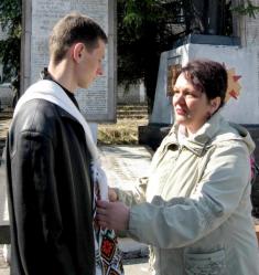 За українським народним звичаєм матері пов’язали своїх синів вишиваними рушниками-оберегами та дали батьківське напуття на гідну службу. А призовники поклали квіти до пам’ятника загиблим у Великій Вітчизняній війні та поклялися перед односельцями не зганьбити рідну землю. Так на Чернігівщині урочисто проводжали новобранців до лав Збройних Сил України.