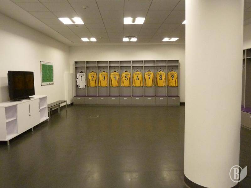 - І вона веде нас до ще однієї досить просторої зали, де з лівого боку ми бачимо нібито ніші, де висить форма гравців з відомими прізвищами: Шевченко, Гусін, Тимощук, Шовковський, Ярмоленко, Мілевський та іншими. Після того, як ми захоплено фотографуємося на цьому фоні, екскурсовод розповідаю, що в цій кімнаті гравці відпочивають. Тут є плазмовий телевізор, який автоматично записує все, що відбувається на полі, у перерві тренер ставить цей відео-матеріал на повторний перегляд, футболісти аналізують свої помилки.