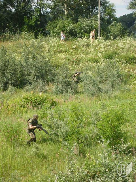 Показовий виступ глядачам запропонували дві страйкбольні команди міста. ALC та «Степные волки» «воювали» прямо біля пішохідного мосту. Справжнє спорядження та бій, от тільки кулі іграшкові ))).