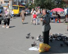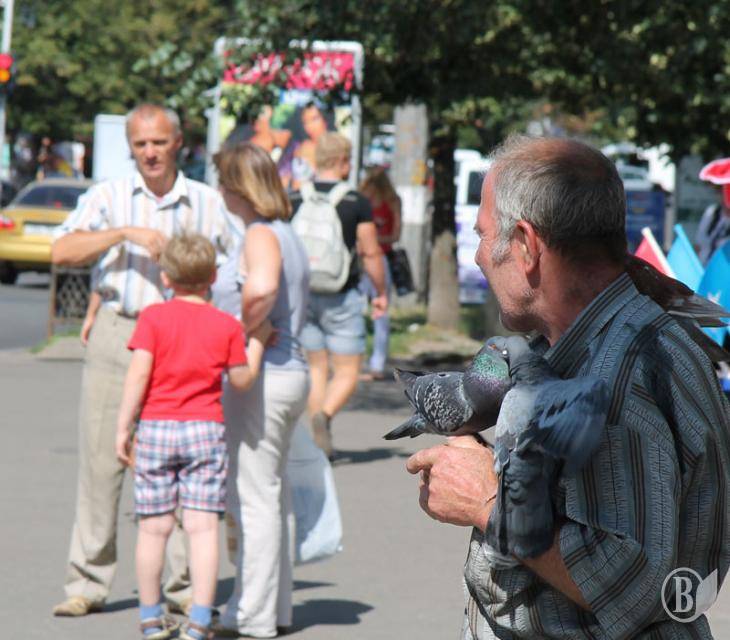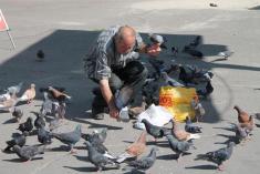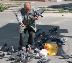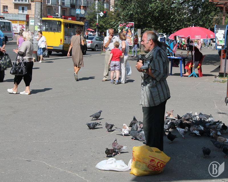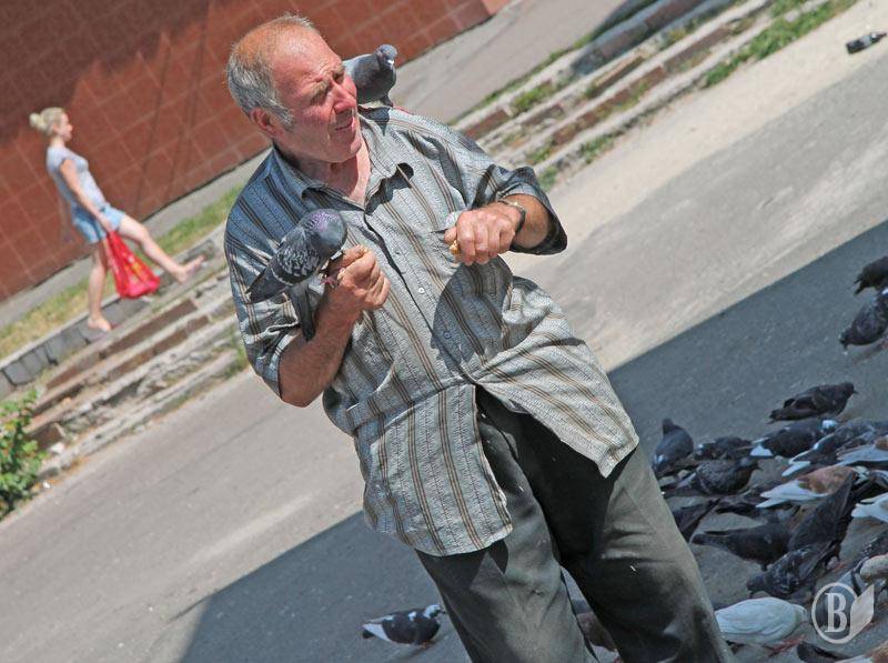 Чоловік особливо не переймається тим, що про нього думають оточуючі. Головне він набрав шматки викинутого кимось хліба і годує птахів.