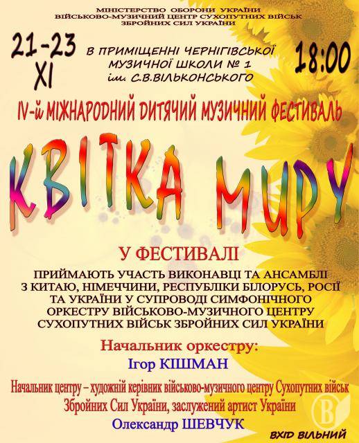 З 21 по 23 листопада у Чернігові проходитиме IV-й міжнародний дитячий музичний фестиваль "Квітка миру" у рамках проекту військово-музичного центру Сухопутних військ Збройних Сил України «Армія - дітям».