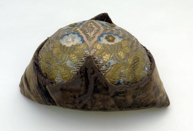 Отож, мав належати представниці достатньо заможної родини, але, на жаль, жодних припущень щодо власниці зробити не можемо. Те саме стосується й іншого “кораблика” (№ И-619) з гірчичної репсової тканини, декорованого гаптованим срібною биттю і сканню орнаментом зі звивистих гілок з квітами, листям, пуп’янками та вишивкою рожевими, блакитними, зеленими, білими шовковими нитками. Закоти – із синього оксамиту, підкладка – з двоколірної вибійки.