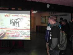 А в фойе техникума шел видеопоказ роликов с пропагандой здорового образа жизни и его преимуществами.