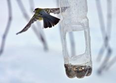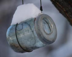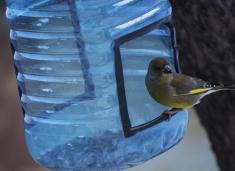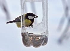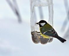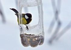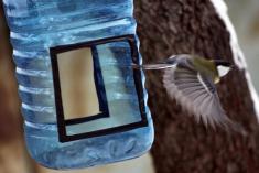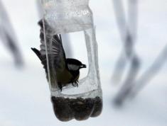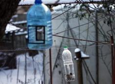 Якщо у вас нема годівнички, то її нескладно зробити з пластикової пляшки. Або прив’язавши півлітрову скляну баночку в горизонтальному положенні.