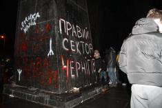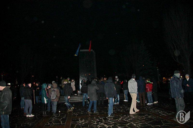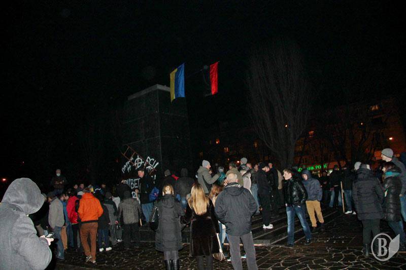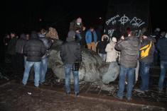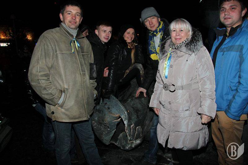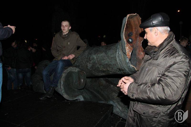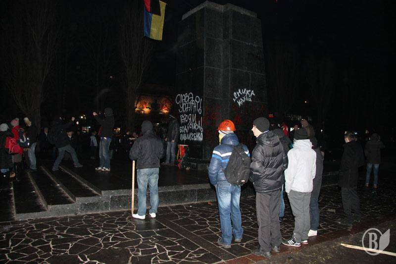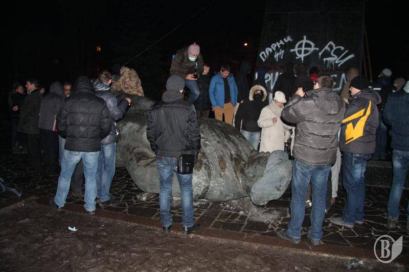 Как сообщал "Высокий Вал", решительно настроенная молодежь подошла вечером к памятнику, который охраняли комсомольцы и коммунисты. После словесного противостояния в ход пошли яйца. Впоследствии местная "Свобода" доставила на место события тросы и лестницы, сторонники коммунистической идеи прекратили оказывать сопротивление.