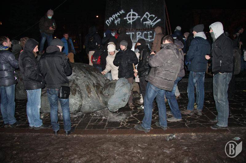 Ленинопад в разгаре. Вандалы? Патриоты? Глупцы? Оценивать можно по-разному. А нужно - однозначно. Правильно! Во-первых, нужно же людям выплеснуть негатив. Так пускай сюда. Вам жалко? А во-вторых , Ленин- это зерно, вернее плевел, который попал нам всем в душу почти 100 лет назад, разложив самую мощную державу мира и потопив ее в крови. Убив в зародыше независимую Украину еще тогда. А потом мерно, шаг за шагом, вытравливал из людей все прекрасное - честь, достоинство, разноцветность душ. А еще подло и цинично кричать "вандалы!" после приказа стрелять. Стрелять через фанерные щиты. Стрелять в голову. Сердце. Чего стоит кусок гранита после всего этого?!