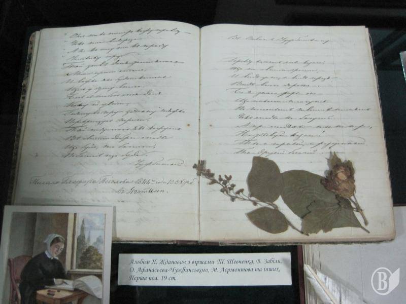 На выставке экспонируется альбом Надежды Жданович, наачатый ею в 1844 году под воздействием встречи с Т. Шевченко в Яготине. Здесь оставили автографы Варвара Репнина, Виктор Забила, сестры Александра и Глафира Псел.