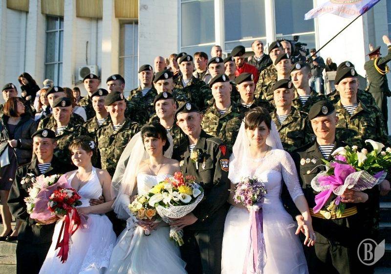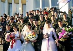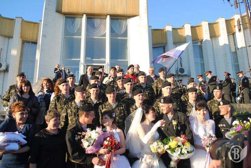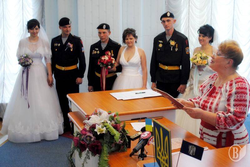 Одразу три морських піхотинця з Феодосійського окремого батальйону морської піхоти ВМС ЗС України зі своїми чарівними нареченими відсвяткували весілля в Центральному відділі державної реєстрації головного управління юстиції міста Києва.