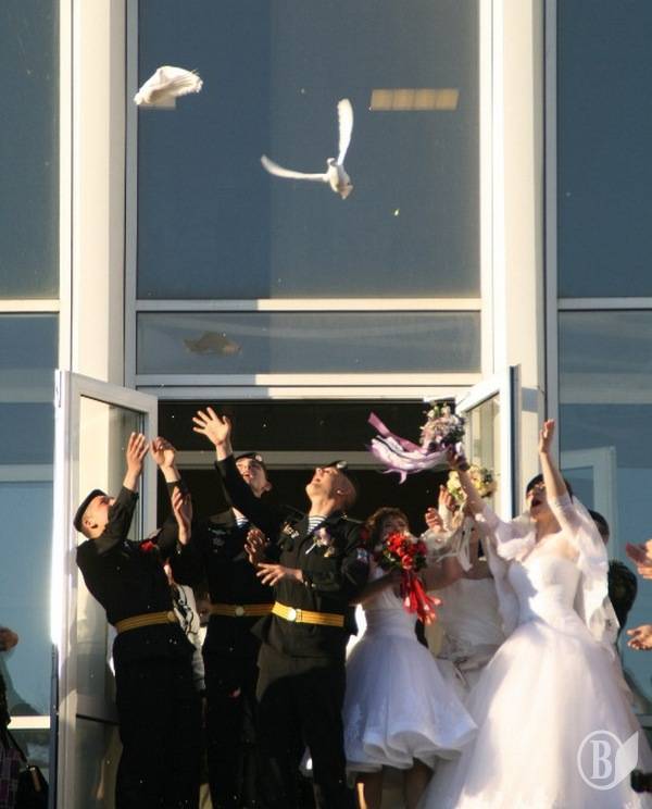 При виході із РАЦСу подружні пари випустили білих голубів, після чого мужні морські піхотинці на руках донесли своїх наречених до трьох весільних автомобілів “Чайка”.