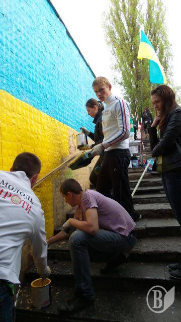 Общественная организация"Молодежь ПРОТИВ"перекрасила подземный переход возле"Украины"в цвета национального флага.