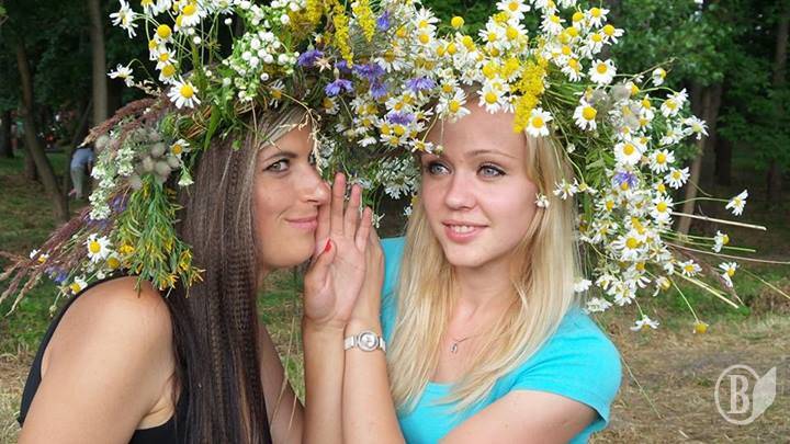 Купальські дівчата в Чернігові готуються до вечорниць. У центральному парку культури і відпочинку. Вони уже сплели віночки. Тепер пускають бісики.
