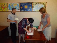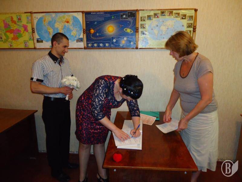 Церемонія хоч і не була урочистою, але мало чим відрізнялась від такої. Весільний букет, марш Мендельсона, рушник та традиційні запитання начальника відділу державної реєстрації актів цивільного стану реєстраційної служби Надії Зайчик «Чи згодні ви стати чоловіком та дружиною?» створили молодятам особливий настрій. Без білої сукні, весільного кортежу, але хвилююче та збентежено молодята отримали свідоцтво про реєстрацію шлюбу.
