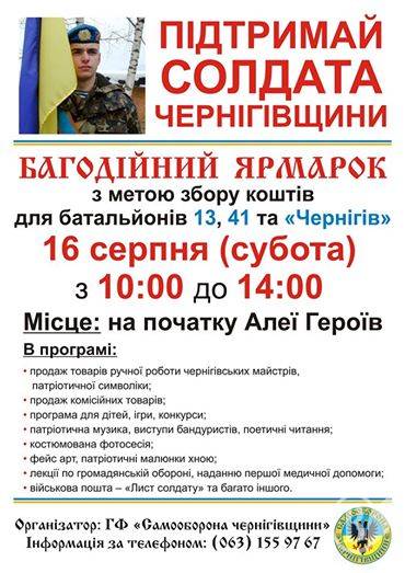 Благотворительная ярмарка «Поддержи солдата Черниговщины» состоится 16 августа в Чернигове.