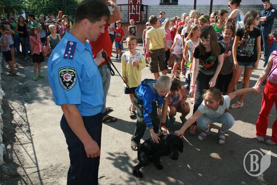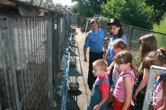 Экскурсию проводил лично капитан милиции Роман Конопацкий, который лишь несколько дней назад вернулся из зоны АТО. Его овчарка Вильма выполняла все команды: «сидеть», «лежать», «место». Потом под искренние детские аплодисменты невысокая ростом Вильма преодолела всю полосу препятствий, с легкостью, преодолев 2-метровый забор.