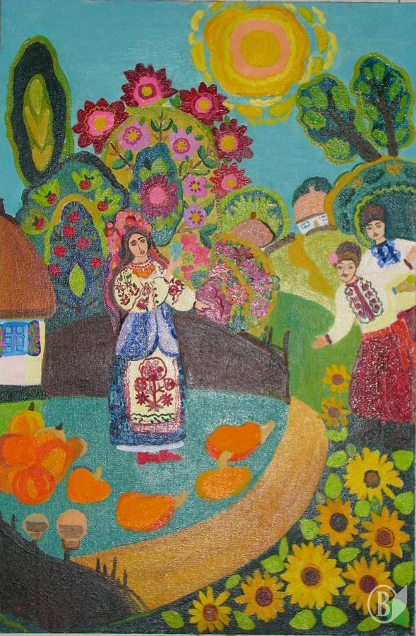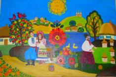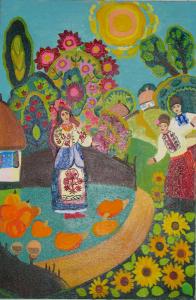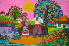 Представленные на выставке картины писаны масляными красками на полотне. Мастерица переняла славные традиции народных мастеров-маляров, вот почему все картины пронизаны национальной тематикой и имеют простой и понятный сюжет, плавность линий и яркие цвета, преисполненные волшебным изобилием красок, мотивами любви и природы. Глядя на картины, будто попадаешь в сказку, в которой около украинского дома изобилует вишневый садик, вычурные цветы выглядывают из-за плетня, слышать аиста, а на фоне буйной природы появляются двое влюбленных: девушка и юноша.