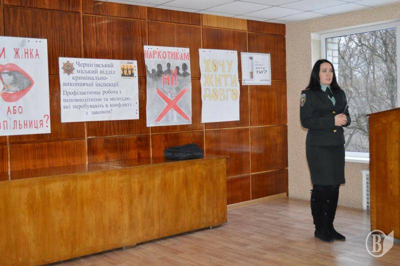 Заступник начальника Чернігівського відділу КВІ Юлія Василенко та Алла Лепеха розповіли молоді про ті небезпеки, що несуть алкоголь, тютюнопаління, а особливо наркоманія. Алла Григорівна Лепеха розповіла про свою діяльність, про місця позбавлення волі та людей, чиї долі були зламані протиправною поведінкою.