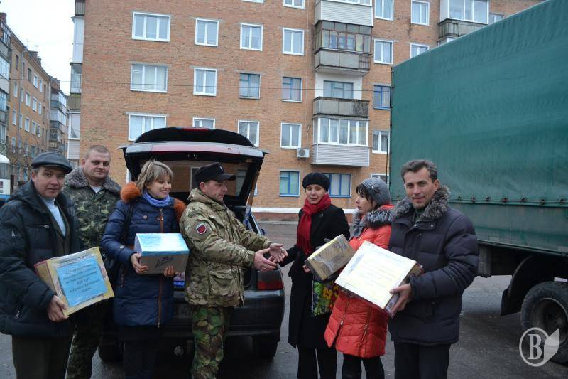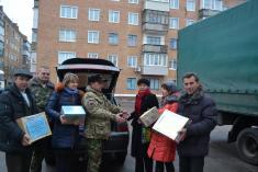 Посилки було передано волонтеру Юрію Сичу, який наступного дня відправлявся в зону АТО під Волноваху, де дислокується Прилуцький батальйон.