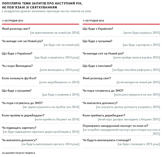 В этом году больше всего непраздничных вопросов о следующем годе было на экономические темы. Пользователей интересовало, что будет с курсами валют, пенсиями и заработной платой, урезают ли социальные выплаты после принятия нового бюджета. Больше всего в сравнении с прошлым годом выросло количество запросов с общей формулировкой “что будет с Украиной”. Некоторые пользователи даже пытались найти ответ у эзотерикив — [что ожидает украину в 2015 году предсказания экстрасенсов].