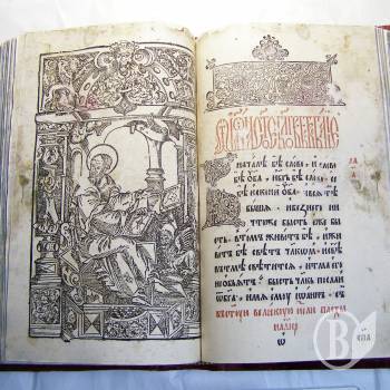Сегодня, наконец, памятка получила вторую жизнь. Евангелие, обвернутое малиновым бархатом XVIII века, являет собой книжный блок из 406 листов. Книга украшена инициалами, заставками и гравюрами, с изображениями евангелистов. К сожалению, не все гравюры удалось реставрировать.