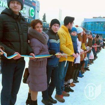 Участники акции с помощью желто-голубой ленты образовали живую цепь единства.