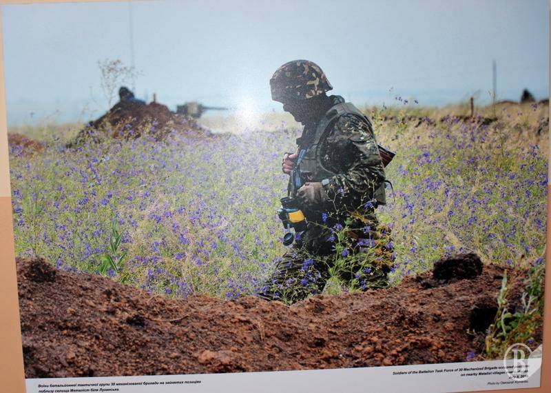 В экспозиции выставки представлено свыше 60 фотографий военных журналистов Центрального печатного органа Министерства обороны Украины «Народная армия» и гражданских корреспондентов ведущих отечественных изданий, которые на протяжении проведения АТО работали в Луганской и Донецкой областях.