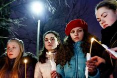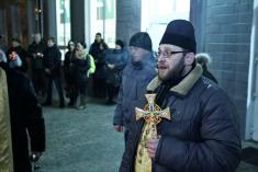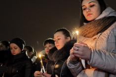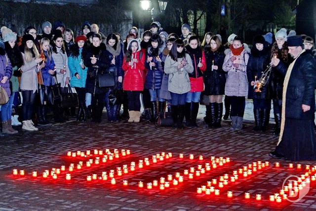 Довкола стояла тиша, потріскував вогонь у запалених лампадок та свічках, які тримають учасники акції. Священнослужителі правили молебень…