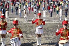 На Красную площадь вышли одновременно около 2000 детей в возрасте от 5 до 18 лет, которые очень красиво, вдохновенно и синхронно заплясали под песню"Я, ты, он, она, вместе - целая страна!"