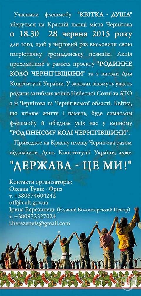 Один з інціаторів акції громадська діячка Оксана Тунік-Фриз, розповіла, що заходи триватимуть два дні. Розпочнуться вони 28 червня концертом дитячих та аматорських колективів Чернігова та області на Красній площі На знак вшанування полеглих на сході воїнів відбудеться флешмоб «Квітка-душа» та молебень біля дошок пошани.